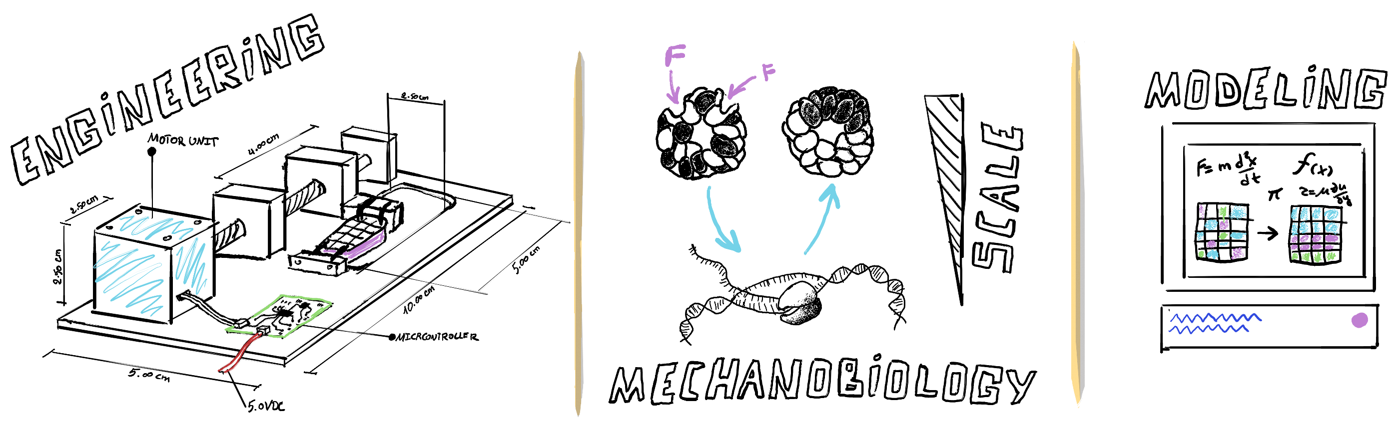 We particularly focus on how local mechanical conditions instruct tissue organization through global morphological and cell state changes, but also tissue disorganization in conditions such as traumatic brain injuries. We take three approaches to address this (1) we engineer our own platforms to mechanically stimulate and measure local and emerging mechanical properties in tissues, (2) we explore mechanobiology across the scales in-vitro, going from multicellular events to molecular drivers (genes and metabolites), in order to characterize and study the dynamic relationship between cells and their extracellular matrix (ECM) microenvironment, (3) we develop computational models to explore the physical laws and logic used by cells to organize, in our effort to establish the mechanical roadmap to tissue organization. Along the way we aim to explore the mechanics of the Dark Morphospace, which will reveal a wealth of alternative morphogenesis to build new/better tissues, tricks to avoid diseases, and teach us about the robustness of our own biology.